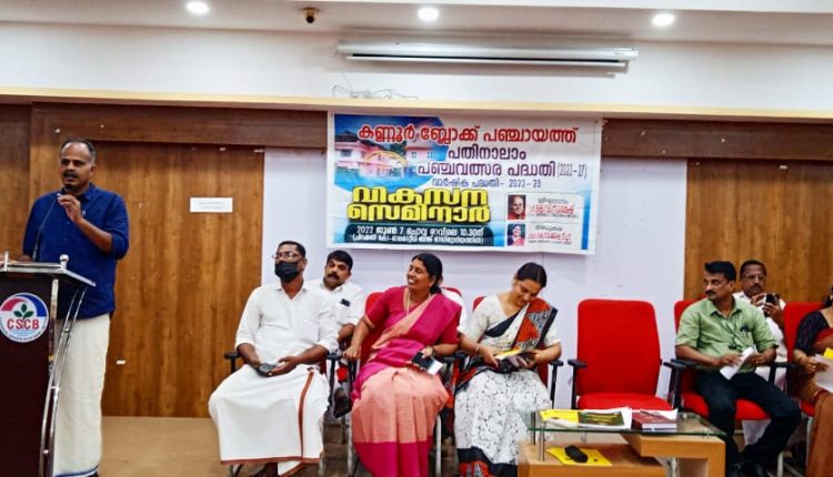 2022-23 വാര്ഷിക പദ്ധതിയുടെ ഭാഗമായി നടന്ന കണ്ണൂര് ബ്ലോക്ക് പഞ്ചായത്ത് വികസന സെമിനാര് കെ വി സുമേഷ് എം എല് എ ഉദ്ഘാടനം ചെയ്തു. ചിറക്കല് സഹകരണ ബാങ്ക് ഓഡിറ്റോറിയത്തില് നടന്ന സെമിനാറില് ബ്ലോക്ക് പഞ്ചായത്ത് പ്രസിഡണ്ട് കെ സി ജിഷ ടീച്ചര് അദ്ധ്യക്ഷത വഹിച്ചു. സ്ഥിരം സമിതി അധ്യക്ഷ പി വി അജിത കരട് പദ്ധതി അവതരിപ്പിച്ചു.