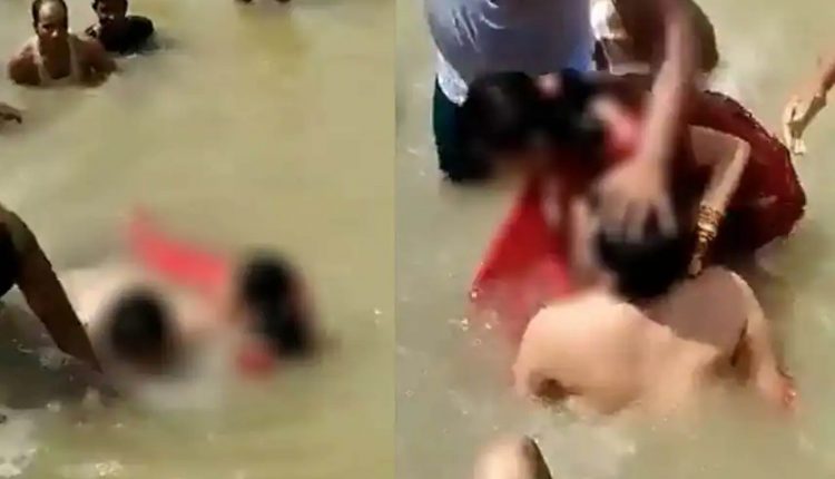 ഒരു സംഘം ആളുകള് ഭര്ത്താവിനെ മര്ദിക്കുന്നതിന്റേയും വലിച്ചിഴയ്ക്കുന്നതിന്റേയും ദൃശ്യങ്ങള് പുറത്തുവന്നിട്ടുണ്ട്. ഭര്ത്താവിനെ നദിയില് നിന്ന് വലിച്ചിഴച്ച് കരയിലേക്ക് കൊണ്ടുവരുന്നതും ഭാര്യ തടയാന് ശ്രമിക്കുന്നതും ദൃശ്യങ്ങളില് കാണാം. പൊതുസ്ഥലത്ത് ഇത്തരത്തില് പെരുമാറുന്നത് ഭാരതീയ സംസ്കാരത്തിന് ചേര്ന്നതല്ലെന്നും നിങ്ങള്ക്ക് കുടുംബമില്ലേ എന്നും ചോദിച്ചാണ് ആള്ക്കൂട്ടം ഇയാളെ മര്ദിക്കുകയായിരുന്നു.