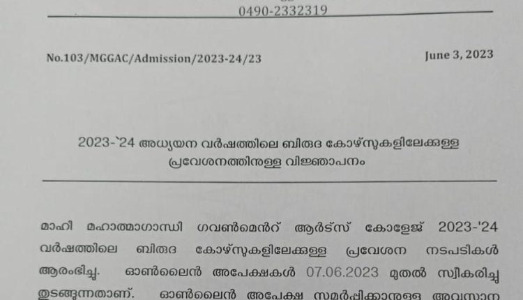 മാഹി: മഹാത്മാഗാന്ധി ഗവ. ആർട്സ് കോളേജിലേക്ക് 2023-24 അദ്ധ്യായന വർഷത്തെ ബിരുദ കോഴ്സുകളിലേക്കുള്ള പ്രവേശനത്തിന് അപേക്ഷ ക്ഷണിച്ചു. അപേക്ഷകൾ ഓൺലൈനായി 7/6/2023 മുതൽ സ്വീകരിക്കും. അപേക്ഷകൾ നൽകേണ്ട അവസാന തീയ്യതി 28/6/2023 ആണ്. എസ്.സി/എസ്.ടി വിഭാഗത്തിന് 150 രൂപയും മറ്റു വിഭാഗങ്ങൾക്ക് 300 രൂപയുമാണ് അപേക്ഷ ഫീസ്.വിശദ വിവരങ്ങൾക്ക് www.mggacmahe.ac.in എന്ന കോളേജ് വെബ് സൈറ്റ് സന്ദർശിക്കേണ്ടതാണെന്ന് പ്രിൻസിപ്പാൾ അറിയിച്ചു.