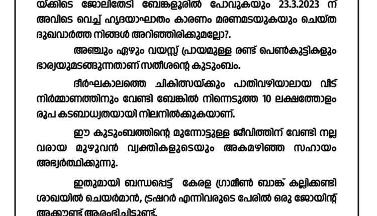 പാനൂർ: തൂവ്വക്കുന്നിലെ ഓട്ടോ ഡ്രൈവറായിരുന്ന മത്തത്ത് സതീശൻ (42) ഒരു വാഹനാപകടത്തിൽ മസ്തിഷ്കത്തിന് ഏറ്റ ആഘാതത്തിന്റെ ഭാഗമായി ദീർഘകാലം അപസ്മാര രോഗത്തിനുള്ള ചികിത്സ നടത്തുകയും തുടർന്ന് ജോലിതേടി ബംഗളൂരുവിൽ പോവുകയും അവിടെ വെച്ച് ഹൃദയാഘാതം മൂലം മരണമടയുകയും ചെയ്തു. അഞ്ചും ഏഴും വയസ്സ് പ്രായമുള്ള രണ്ട് പെൺകുട്ടികളും ഭാര്യയുമടങ്ങുന്നതാണ് സതീശന്റെ കുടുംബം. ദീർഘകാലത്തെ ചികിത്സയ്ക്കും പാതിവഴിയാലായ വീട്