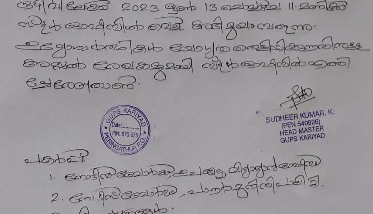കരിയാട് : കരിയാട് ഗവ.യു.പി.സ്കൂളിൽ , [ ഒലിപ്പിൽ ] നിലവിലുള്ള ഫുൾ ടൈം ജൂനിയർ ലാംഗ്വേജ് ടീച്ചറുടെ ഒഴിവിലേക്ക് 2023 ജൂൺ 13 ചൊവ്വാഴ്ച രാവിലെ 11 മണിക്ക് സ്കൂൾ ഓഫീസിൽ വെച്ച് അഭിമുഖം നടത്തുന്നു. ഉദ്യോഗാർത്ഥികൾ യോഗ്യത തെളിയിക്കുന്ന അസ്സൽ രേഖകളുമായി ഹാജരാകേണ്ടതാണെന്ന് ഹെഡ് മാസ്റ്റർ അറിയിക്കുന്നു.
