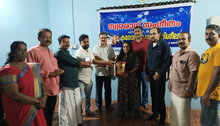 ചാലക്കരയുടെ പാട്ടുകാരി കുമാരി ശീതളിനെ സ്വരരാഗ് സംഗീത പഠന കേന്ദ്രം അനുമോദിച്ചു. ഗായകൻ കെ.കെ. സന്തോഷ് കുമാർ കേഷ് അവാർഡും ഉപഹാരവും സമ്മാനിച്ചു. പ്രശാന്ത് മാസ്റ്റർ, ,മുഹമ്മദ് അലി, സജീവൻ, പ്രദീപ് കുമാർ, നിർമൽ കുമാർ സംസാരിച്ചു. ചിത്രവിവരണം: കെ.കെ. സന്തോഷ്കുമാർ ഉപഹാരം നൽകുന്നു.
