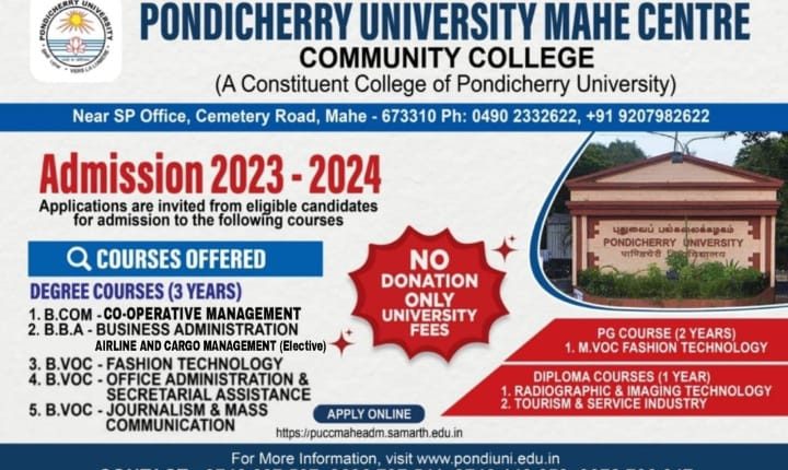 കേന്ദ്രസർവകലാശാല മാഹി കേന്ദ്രത്തിൽ പ്രവർത്തിക്കുന്ന കമ്മ്യൂണിറ്റി കോളേജിൽ ഈ വർഷത്തെ ബിരുദ പ്രവേശന നടപടികൾ തുടങ്ങി ഈ വർഷം പുതിയ രണ്ട് ബിരുദ കോഴ്സുകളായി ബി.കോം കോ-ഓപ്പറേറ്റീവ് മാനേജ്മെന്റ് , ബി . ബി . എ . ബിസിനസ് അഡ്മിനിസ്ട്രേഷൻ എയർലൈൻ & കാർഗോ മാനേജ്മെന്റ്) എന്നിവ ആരംഭിക്കുന്നു. വൊക്കേഷണൽ ഡിഗ്രി കോഴ്സുകളായ ഓഫീസ് അഡ്മിനിസ്ട്രേഷൻ & സെക്രട്ടറിയൽ അസിസ്റ്റൻസ്, ഫാഷൻ ടെക്നോളജി, ജേണലിസം & മാസ്സ് കമ്മ്യൂണിക്കേഷൻ, പിജി കോഴ്സ് എം.വോക് ഫാഷൻ ടെക്നോളജി, ഡിപ്ലോമ കോഴ്സുകളായ റേഡിയോഗ്രഫി & ഇമേജിംഗ് ടെക്നോളജി ടൂറിസം & സർവീസ് ഇൻഡസ്ട്രിയിലേക്കുള്ള കോഴ്സുകളിലേക്കും ഇപ്പോൾ അപേക്ഷിക്കാം. ഡിഗ്രീ കോഴ്സുകൾക്ക് മൂന്നുവർഷവും പിജിക്ക് രണ്ടുവർഷവും ഡിപ്ലോമ കോഴ്സിന് ഒരുവർഷമാണ് . പോണ്ടിച്ചേരി യൂണിവേഴ്സിറ്റി നേരിട്ട് നടത്തുന്ന മാഹി കമ്മ്യൂണിറ്റി കോളേജിൽ ഓൺലൈനായി അപേക്ഷ സമർപ്പിക്കേണ്ടത് . അപേക്ഷാ ഫീസ് 100 രൂപ എസ്.സി / എസ്. ടി വിഭാഗം വിദ്യാർത്ഥികൾക്ക് ഇത് 50 രൂപ . ഭിന്നശേഷിക്കാരായ വിദ്യാർത്ഥികൾക്ക് അപേക്ഷാ ഫീസില്ല . മാഹിയുൾപ്പെടുന്ന പുതുച്ചേരിയിലെയും കേരളത്തിലെയും മറ്റ് സംസ്ഥാനങ്ങളിലെയും വിദ്യാർത്ഥികൾക്ക് അപേക്ഷിക്കാവുന്നതാണ് . എസ് . സി / എസ് ടി , ഒബിസി , ഇ . ഡബ്ല്യൂ.എസ്. , വിദ്യാർത്ഥികൾക്ക് നിയമാനുസൃതമായ സംവരണം ഉണ്ടായിരിക്കുന്നതാണ്. ഒരു തരത്തിലുമുള്ള സംഭാവനയോ , പി . ടി . എ പിരിവോ കോളേജ് പ്രവേശനത്തിന് ഇല്ല .