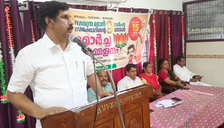 സമസ്ത മേഖലകളിലും ജനക്ഷേമ കരമായ പദ്ധതികൾ നടപ്പിലാക്കുവാൻ നരേന്ദ്രമോദി സർക്കാറിന് കഴിഞ്ഞുവെന്ന് ബിജെപി ജില്ലാ പ്രസിഡന്റ് എൻ. ഹരിദാസ് പറഞ്ഞു.നരേന്ദ്രമോദി സർക്കാർ 9 വർഷ0 പൂർത്തീകരണ ആഘോഷത്തോടനുബന്ധിച്ച് പാനൂർ വ്യാപാര ഭവനിൽ ചേർന്ന മോർച്ചകളുടെ സംയുക്ത സമ്മേളനം ഉദ്ഘാടനം ചെയ്ത് സംസാരിക്കുകയായിരുന്നു അദ്ദേഹം.കേന്ദ്രത്തിലെ കഴിഞ്ഞ 9 വർഷത്തെ സർക്കാർ പൂർണ്ണമായും അഴിമതി രഹിതമാണ്.നരേന്ദ്രമോദി സർക്കാറിന്റെ ഒമ്പത് വർഷ പൂർത്തീകരണ ആഘോഷത്തോടനുബന്ധിച്ചാണ് മോർച്ചകളുടെ സംയുക്ത സമ്മേളനം നടന്നത്. ജൂൺ 20 മുതൽ 30 വരെ നടക്കുന്ന ജനസമ്പർക്ക പരിപാടി വിജയിപ്പിക്കാൻ അദ്ദേഹം ആഹ്വാനം ചെയ്തു.