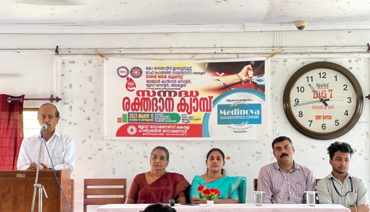 തലശ്ശേരി: കോപ്പറേറ്റീവ് ഇൻസ്റ്റിറ്റ്യൂട്ട് ഓഫ് ഹെൽത്ത് സയൻസ് തലശ്ശേരി എൻഎസ്എസ് യൂണിറ്റും ബ്ലഡ് ഡോണർസ് കേരള ഇരിട്ടി താലൂക്ക് ഘടകവും മലബാർ കാൻസർ സെന്ററും സംയുക്തമായി രക്തദാന ക്യാമ്പ് നടത്തി. എൻഎസ്എസ് വളണ്ടിയർ ഗീതിക എസ് നായർ സ്വാഗതം പറഞ്ഞു. ക്യാമ്പിന്റെ ഉദ്ഘാടനം തലശ്ശേരി മുനിസിപ്പാലിറ്റി ചെയർപേഴ്സൺ ജമുനാ റാണി ടീച്ചർ നിർവഹിച്ചു. കോപ്പറേറ്റീവ് ഇൻസ്റ്റിറ്റ്യൂട്ട് ഓഫ് ഹെൽത്ത് സയൻസ് പ്രിൻസിപ്പൽ പ്രൊഫസർ സജീ വി. ടി അധ്യക്ഷത വഹിച്ചു. കേരള കോ-ഓപ്പറേറ്റീവ് ഹോസ്പിറ്റൽ ഫെഡറേഷൻ ലിമിറ്റഡ് മാനേജിംഗ് ഡയറക്ടർ സി മോഹനൻ, ഡെവലപ്മെന്റ് ഓഫീസർ ജിജു ജനാർദ്ദനൻ എന്നിവർ ആശംസകൾ അർപ്പിച്ച് സംസാരിച്ചു. കോളേജ് യൂണിയൻ ചെയർമാൻ അശ്വന്ത് നന്ദി രേഖപ്പെടുത്തി. ബ്ലഡ് ഡോണേഴ്സ് കേരള ഇരിട്ടി താലൂക്ക് കമ്മിറ്റി ക്യാമ്പിൽ നേതൃപരമായ പങ്കുവഹിച്ചു. ബ്ലഡ് ഡോണേഴ്സ് കേരള തലശ്ശേരി ജോയിൻ സെക്രട്ടറി സൈനുദ്ദീൻ രക്തദാനത്തെ പറ്റി ക്ലാസ് എടുത്തു. കോപ്പറേറ്റീവ് ഇൻസ്റ്റിറ്റ്യൂട്ട് ഓഫ് ഹെൽത്ത് സയൻസസിലെ 45 വിദ്യാർത്ഥികൾ രക്തദാനം നടത്തി. കോപ്പറേറ്റീവ് ഇൻസ്റ്റ്യൂട്ട് ഓഫ് ഹെൽത്ത് സയൻസ് എൻഎസ്എസ് യൂണിറ്റിന്റെ നേതൃത്വത്തിലാണ് ക്യാമ്പ് നടന്നത്.