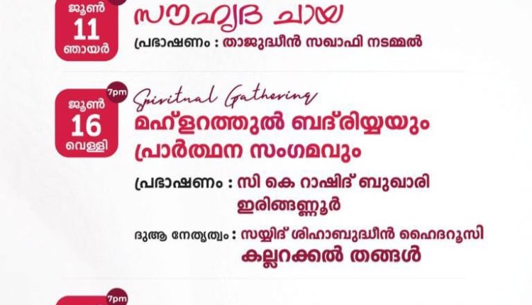 പാത്തിപ്പാലം : എസ് എസ് എഫ് മൊകേരി സെക്ടർ സാഹിത്യോത്സവ് ജൂൺ 17 ന് വൈകിട്ട് 7 മണിക്ക് പാത്തിപ്പാലത്ത് ഷമ്മാസ്. മുസ് ലിയാരുടെ അദ്ധ്യക്ഷതയിൽ ചേരുന്ന യോഗത്തിൽ നോവലിസ്റ്റ് സുരേഷ് ബാബു മാവിലേരി ഉദ്ഘാടനം ചെയ്യും. എസ്.എസ്.എഫ് ജനറൽ സെക്രട്ടറി സൈഫുദ്ദീൻ പെരളശ്ശേരി സന്ദേശ ഭാഷണം നടത്തും. മൊകേരി പഞ്ചായത്ത് പ്രസിഡണ്ട് പി.വത്സൻ മുഖ്യതിഥിയായി പങ്കെടുക്കും. പഞ്ചായത്ത് വിദ്യാഭ്യാസ ആരോഗ്യ സ്റ്റാന്റിങ്ങ് കമ്മിറ്റി ചെയർമാൻ റഫീഖ് വി പി ചടങ്ങിൽ സംബന്ധിക്കും. മുസമ്മിൽ സഖാഫി കൂറ്റേരി , ആഷിഖ് നൂറാനി , അബ്ദുള്ള ഹാജി , റഷാദ് സി.വി എന്നിവർ ചടങ്ങിൽ സംബന്ധിക്കും. മുഹമ്മദ് കടേപ്രം സ്വാഗതവും സിനാൻ നൂറേനി തങ്ങൾ പീടിക നന്ദിയും പറയും. 18 ന് ഞായറാഴ്ച സമാപന സമ്മേളനവും കലാസാഹിത്യ മത്സങ്ങളും നടക്കും.