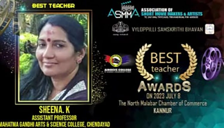 കണ്ണൂർ: അസോസിയേഷൻ ഓഫ് ഷോർട് മൂവിമെയ് കേർസ് & ആർടിസ്റ്റ് [എ എസ് എം എം എ ] ബസ്റ്റ് ടീച്ചർ അവാർഡ് 2023 പ്രൊ. കെ.ഷീനക്ക് ലഭിച്ചു. അസ്മായും വൈലോപ്പള്ളി സംസ്കൃതി ഭവനുമായി ചേർന്നാണ് ബെസ്റ്റ് ടീച്ചർ അവാർഡും ഷോർട് ഫിലിം അവാർഡും നൽകുന്നത്. ചെണ്ടയാട് മഹാത്മ ഗാന്ധി ആർട്സ് & സയൻസ് കോളജിലെ അസിസ്റ്റന്റ് പ്രൊഫസറാണ് കെ.ഷീന.