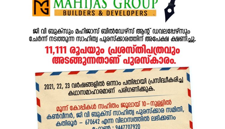 കതിരൂർ : ജീവി ബുക്സും മഹിജാസ് ബിൽഡേഴ്സ് & ഡവലപ്പേഴ്സും ചേർന്ന് നല്കുന്ന സാഹിത്യ പുരസ്കാരത്തിന് അപേക്ഷ ക്ഷണിച്ചു. 11,111 രൂപയും പ്രശസ്തിപത്രവും അടങ്ങുന്നതാണ് പുരസ്കാരം. 2021 – 22-23 വർഷങ്ങളിൽ ഒന്നാം പതിപ്പായി പ്രസിദ്ധീകരിച്ച കഥാസമാഹാരമണ് പുരസ്കാര നിർണയത്തിന് പരിഗണിക്കുന്നത്. പുസ്തകത്തിന്റെ മൂന്ന് കോപ്പികൾ ജൂലായ് പത്തിനകം കൺവീനർ, ജീവിബുക്സ് , സാഹിത്യപുരസ്കാരസമിതി, കതിരൂർ , 670642. എന്ന വിലാസത്തിൽ ലഭിക്കണം കൂടുതൽ വിവരങ്ങൾക്ക് 944770 79 20 എന്ന നമ്പറിൽ ബന്ധപ്പെടാം.