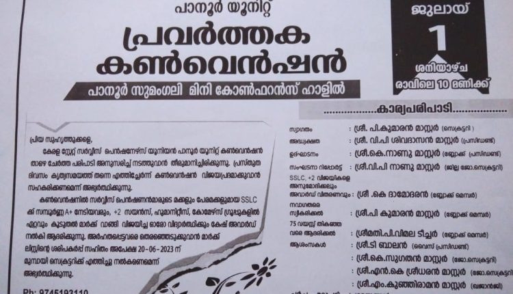 കേരള സർവ്വീസ് പെൻഷനേർസ് യൂണിയൻ പാനൂർ യൂനിറ്റ് പ്രവർത്തക കൺവെൻഷൻ ജൂലായ് 1 ശനിയാഴ്ച രാവിലെ 10 മണിക്ക് പാനൂർ സുമംഗലി മിനി കോൺഫറൻസ് ഹാളിൽ നടക്കും. പെൻഷണർമാരുടെ കുടുംബാംഗങ്ങളിൽ 2023 ലെ എസ് എസ് എൽ സി , പ്ലസ് ടു പരീക്ഷകളിൽ മികച്ച വിജയം നേടിയവരെ കേഷ് അവാർഡ് നൽകി ആദരിക്കും.