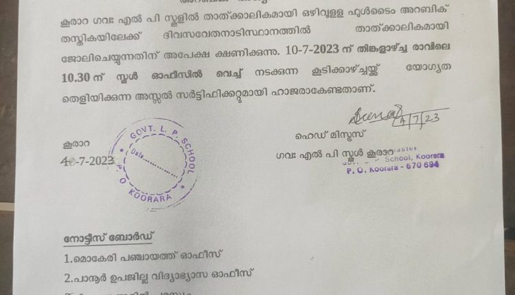 പാനൂർ: കൂരാറ ഗവ.എൽ.പി.സ്ക്കൂളിൽ ഒഴിവുള്ള ഫുൾ ടൈം അറബിക് തസ്തികയിലേക്ക് ദിവസവേതനത്തിൽ താല്ക്കാലിക ജോലി ചെയ്യുന്നതിന് അപേക്ഷ ക്ഷണിച്ചു.അർഹതയുള്ളവർ ജൂലായ് 10 ന് രാവിലെ 10.30 ന് സ്ക്കൂൾ ഓഫീസിൽ നടക്കുന്ന കൂടിക്കാഴ്ചക്ക് യോഗ്യത തെളിയിക്കുന്ന അസ്സൽ സർട്ടിഫിക്കറ്റുമായി ഹാജരാകേണ്ടതാണ്.