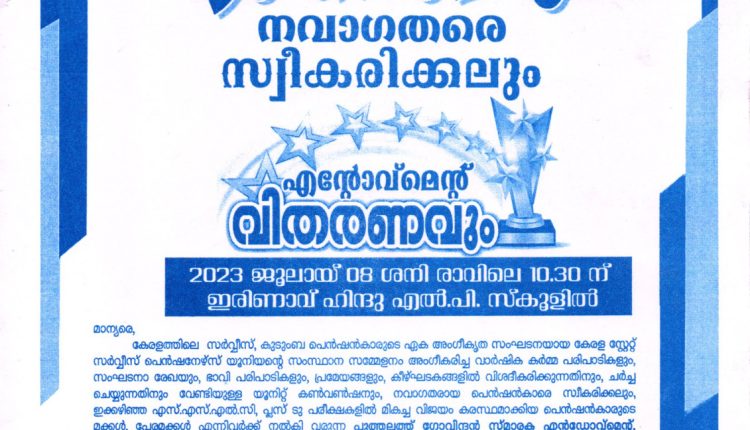 ഇരിണാവ് :കേരള സ്റ്റേറ്റ് സർവീസ് പെൻഷനേഴ്സ് യൂണിയൻ ഇരിണാവ് യുണിറ്റ് കൺവെൻഷൻ ജൂലായ് 8 ശനിയാഴ്ച രാവിലെ 10.30 ന് ബ്ലോക്ക് വൈസ് പ്രസിഡൻ്റ് പി വി കുഞ്ഞിരാമൻ മാസ്റ്റർ ഉദ്ഘാടനം ചെയ്യും. എസ് എസ് എൽ സി, പ്ലസ് ടു പരീക്ഷകളിൽ ഉന്നത വിജയം നേടിയ അംഗങ്ങളുടെ മക്കൾക്കും പേര മക്കൾക്കും കുഞ്ഞിക്കണ്ണൻ പോള, പുത്തലത്ത് ഗോവിന്ദൻ എന്നിവരുടെ സ്മരണാർത്ഥം കുടുംബാംഗങ്ങൾ ഏർപ്പെടുത്തിയ എൻ്റോവ് മെൻ്റുകൾ ബ്ലോക്ക് ജോയൻ്റ് സെക്രട്ടറി എം ശൈലജ വിതരണം ചെയ്യും. നവാഗതരായ അംഗങ്ങൾക്ക് ജില്ലാ ട്രഷറർ എ നാരായണൻ സ്വീകരണം നൽകും. എം വി ലീല, ഇ പി ഓമന എന്നിവർ ആശംസാ പ്രസംഗം നടത്തും. പി മനോഹരൻ സ്വാഗതവും, സി കുഞ്ഞിരാമൻ നന്ദിയും പറയും