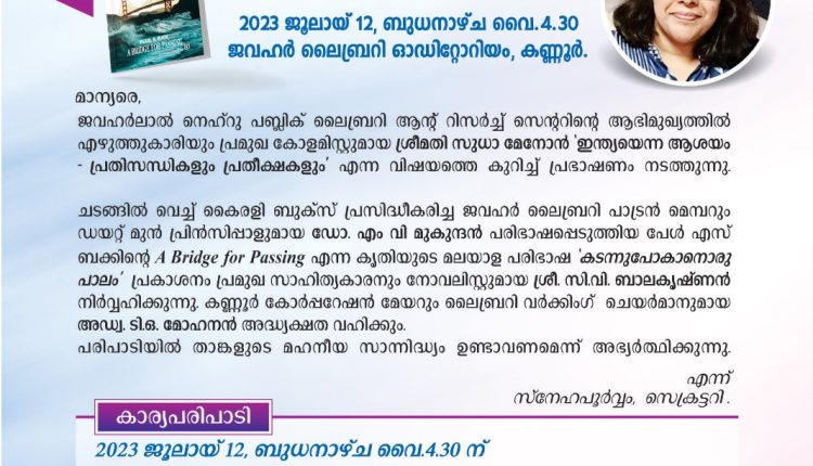 കണ്ണൂർ: ജവഹർലാൽ നെഹ്റു പബ്ലിക്ക് ലൈബ്രറി & റിസർച്ച് സെന്ററിന്റെ ആഭിമുഖ്യത്തിൽ കണ്ണൂർ ജവഹർ ലൈബ്രറി ഓഡിറ്റോറിയത്തിൽ വെച്ച് ജൂലായ് 12 ബുധനാഴ്ച വൈകിട്ട് 4.30 ന് സുധാമേനോന്റെ പ്രഭാഷണവും പുസ്തകപ്രകാശനവും നടക്കും.