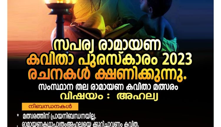 കണ്ണൂർ: സപര്യ സാംസ്കാരിക സമിതിയുടെ ആഭിമുഖ്യത്തിൽ സപര്യ രാമായണ കവിതാ പുരസ്കാരം 2023 ന് രചനകൾ ക്ഷണിക്കുന്നു.അഹല്യ എന്ന വിഷയത്തെ അടിസ്ഥാനമാക്കിയാണ് മത്സരം