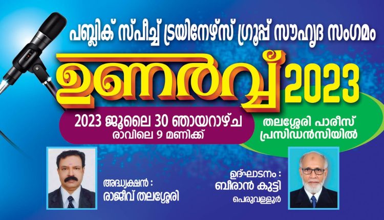 ഉണർവ്വ് 2023 ജൂലായ് 30 ഞായറാഴ്ച KeralaLatest By sneha@9000 Last updated Jul 28, 2023 0 Share തലശ്ശേരി : പബ്ലിക്ക് സ്പീച്ച് ട്രെയിനേർസ് ഗ്രൂപ്പ് സൗഹൃദ സംഗമം ” ഉണർവ്വ് 2023 ” ജൂലായ് 30 ഞായറാഴ്ച രാവിലെ 9 മണിക്ക് തലശ്ശേരി പാരീസ് പ്രസിഡൻസിയിൽ നടക്കുന്നു. രാജീവ് തലശേരിയുടെ അദ്ധ്യക്ഷതയിൽ നടക്കുന്ന സംഗമം ബീരാൻ കുട്ടി പെരുവെള്ളൂർ ഉദ്ഘാടനം ചെയ്യും. 0 Share
