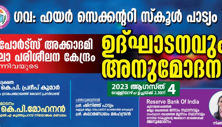 കൂത്തുപറമ്പ് : പാട്യം ഗവ.ഹൈസ്കൂളിന്റെ ആഭിമുഖ്യത്തിൽ സ്പോർട്സ് അക്കാദമി , കലാപരിശീലന കേന്ദ്രം എന്നിവയുടെ ഉദ്ഘാടനവും അനുമോ ദനവും ആഗസ്ത് 4 വെള്ളിയാഴ്ച കെ.പി. മോഹനൻ എം.എൽ എ ഉദ്ഘാടനം ചെയ്യും.