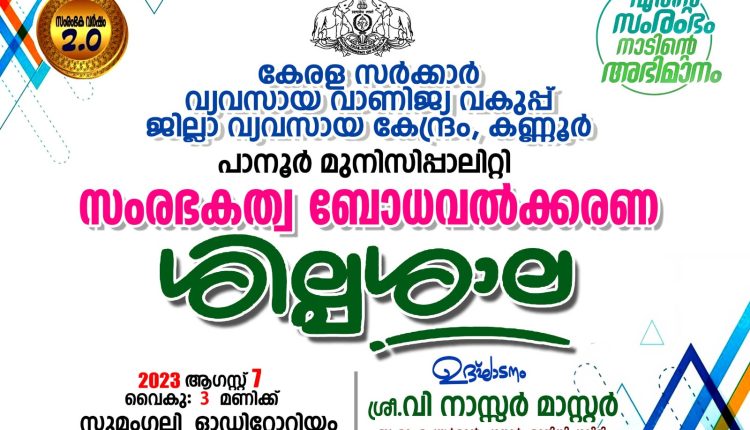 2023 ആഗസ്റ്റ് 7 ന് വൈകുന്നേരം 3 മണിക്ക് വ്യപാര ഭവനിൽ നിശ്ചയിച്ചിരുന്ന സംരംഭകത്വ ബോധവല്ക്കരണ ശില്പശാല അന്നേ ദിവസം (2023 ആഗസ്റ്റ് 7 ന് ) വൈകുന്നേരം 3 മണിക്ക് സുമംഗലി ഓഡിറ്റോറിയത്തിലേക്ക് മാറ്റിയതായി അറിയിക്കുന്നു.