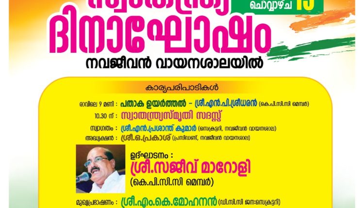പെരളശേരി : മൂന്നാം പാലം നവജീവൻ വായനശാല ജവഹർ മന്ദിരത്തിന്റെ ആദിമുഖ്യത്തിൽ ആഗസ്ത് 15 ദേശീയ സ്വാതന്ത്ര്യ ദിനത്തിൽ, നവജീവൻ വായനശാലയിൽ സ്വാതന്ത്ര്യ ദിനാഘോഷം സംഘടിപ്പിക്കുന്നു. നവജീവൻ വായനശാല പ്രസിഡണ്ട് ഒ . പ്രകാശിന്റെ അദ്ധ്യക്ഷതയിൽ രാവിലെ 10.30 ന് ചേരുന്ന സ്വാതന്ത്ര്യ സ്മൃതി സദസ്സ് കെ.പി.സി.സി. മെമ്പർ സജീവ് മാറോളി ഉദ്ഘാടനം ചെയ്യും.