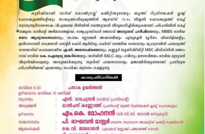 പെരളശേരി : കുഴിക്കിലായി വാർഡ് കോൺഗ്രസ്സ് കമ്മിറ്റിയുടെയും ചോരക്കുളം യൂത്ത് റിക്രിയേഷൻ ക്ലബ്ബിന്റേയും സംയുക്താഭിമുഖ്യത്തിൽ സ്വാതന്ത്ര്യ ദിനാഘോഷം വിവിധ പരിപാടകളോടെ നടത്തുന്നു.