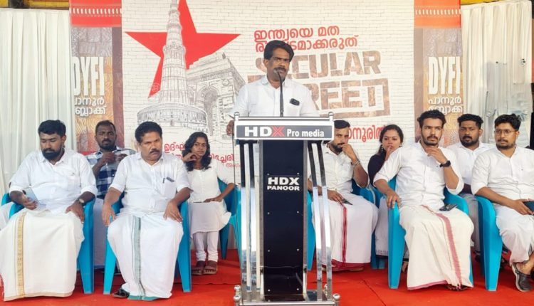 പാനൂർ : ഡിവൈഎഫ്ഐ പാനൂർ ബ്ലോക്ക് കമ്മിറ്റിയുടെ നേതൃത്വത്തിൽ നടന്ന സെക്യുലർ സ്ട്രീറ്റ് പാനൂർ ബസ്റ്റാൻ്റിൽ ഡിവൈഎഫ്ഐ മുൻ കേന്ദ്ര കമ്മിറ്റിയംഗം നിധിൻ കണിച്ചേരി ഉദ്ഘാടനം ചെയ്തു. സ്വാഗത സംഘം ചെയർമാൻ കെകെ സുധീർകുമാർ അധ്യക്ഷനായി. കെ ഷിൻ്റു, അക്ഷയ് പാലക്കൂൽ, കെപി വിവേക് ,രശ്മി കളത്തിൽ എന്നിവർ സംസാരിച്ചു. പാനൂർ ബ്ലോക്ക് സെക്രട്ടറി കിരൺ കരുണാകരൻ സ്വാഗതം പറഞ്ഞു. പാനൂർ രാജു മാസ്റ്റർ സ്മാരക മന്ദിരം കേന്ദ്രീകരിച്ചു സെക്യുലർ സ്ട്രീറ്റിൻ്റെ ഭാഗമായി നടന്ന ബഹുജന പ്രകടനത്തിൽ ബ്ലോക്കിലെ 16 മേഖല കേന്ദ്രങ്ങളിലായി ആയിരങ്ങൾ അണിനിരന്നു.