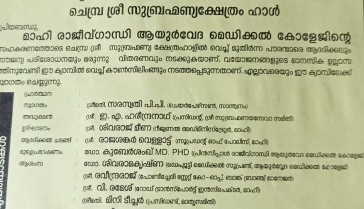മാഹി : ചെമ്പ്ര ശ്രീ സുബ്രഹ്മണ്യ സേവാ സമിതിയുടേയും, സാന്ത്വനം മാഹിയുടേയും സംയുക്താഭിമുഖ്യത്തിൽ ചാലക്കര രാജീവ് ഗാന്ധി ആയുർവ്വേദ മെഡിക്കൽ കോളജിൻ്റെ സഹകരണത്തോടെ ആഗസ്ത് 18 ന് കാലത്ത് 10 മണിക്ക് ചെമ്പ്ര സുബ്രഹ്മണ്യ ക്ഷേത്രം ഹാളിൽ സൗജന്യ ആയുർവ്വേദ പരിശോധനയും, മരുന്ന് വിതരണവും നടക്കും.ചടങ്ങിൽ മുതിർന്ന പൗരന്മാരെ ആദരിക്കും. ക്ഷേത്രം പ്രസിഡണ്ട് ഇ.എ.ഹരീന്ദ്രനാഥിൻ്റെ അദ്ധ്യക്ഷതയിൽ റീജ്യണൽ അഡ്മിനിസ്ട്രേറ്റർ ശിവ് രാജ് മീണ ഉദ്ഘാടനം ചെയ്യും. പൊലീസ് സൂപ്രണ്ട് രാജശങ്കർ വെള്ളാട്ട് മുതിർന്ന പൗരന്മാരെ ആദരിക്കും. ഡോ.. കുബേർ ശംഖ് മുഖ്യഭാഷണം നടത്തും.