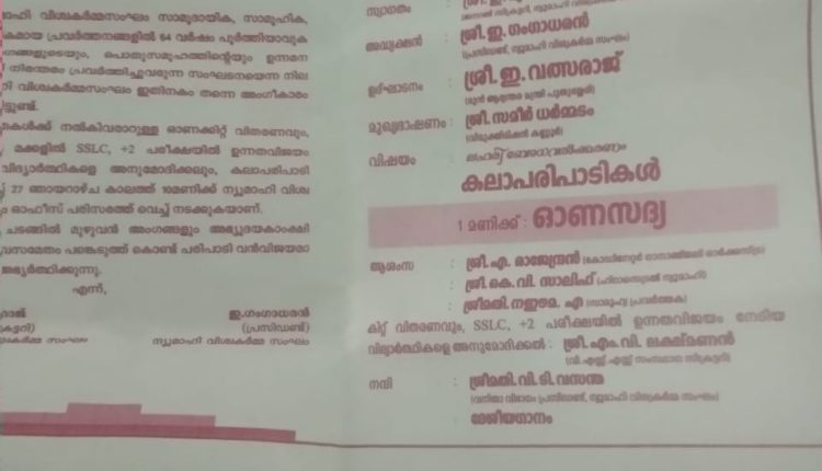 ന്യൂമാഹി: വിശ്വകർമ്മ സംഘത്തിന്റെ ആഭിമുഖ്യത്തിൽ ആഗസ്റ്റ് 27 ന് രാവിലെ 10 മണിക്ക് ഓണാഘോഷ പരിപാടികൾ നടത്തുന്നു. ഓണാഘോഷ പരിപാടികളുടെ ഉദ്ഘാടനം മുൻ മന്ത്രി ഇ. വത്സരാജ് നിർവ്വഹിക്കും. ലഹരി ബോധ വൽക്കരണ സെമിനാർ ഉണ്ടാകും.