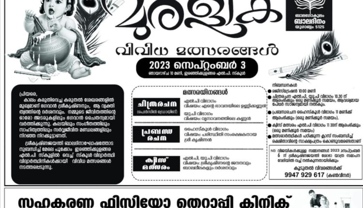 പാനൂർ : ബാലഗോകുലത്തിന്റെ നേതൃത്വത്തിൽ ശ്രീകൃഷ്ണ ജയന്തി ബാലദിനാഘോഷത്തോടനുബന്ധിച്ച് നാളെ മേലെ പൂക്കോം ഇരഞ്ഞിക്കുളങ്ങര എൽപി സ്കൂളിൽ വെച്ച് വിദ്യാർത്ഥികൾക്കായി വിവിധ മത്സരങ്ങൾ നടക്കുന്നതാണ്.മത്സരങ്ങൾ സപ്തമ്പർ 3 ഞായറാഴ്ച 10 മണിക്ക് ആരംഭിക്കും.