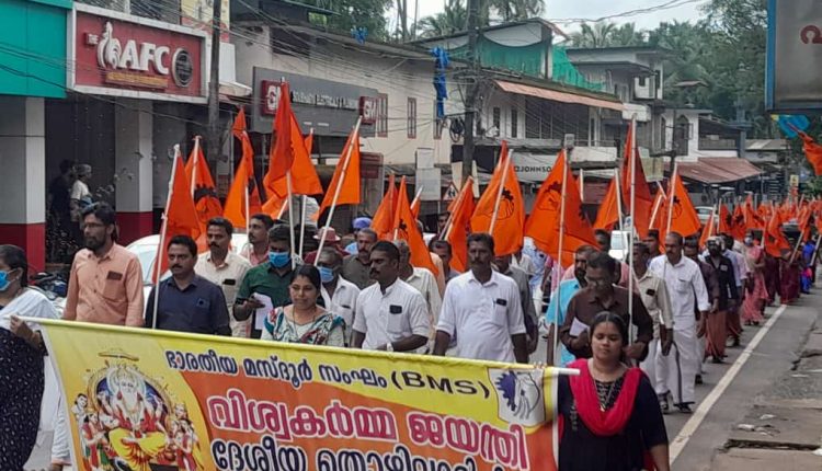 പാനൂർ: വിശ്വകർമ്മജയന്തി ദേശീയ തൊഴിലാളി ദിനാചരണത്തോടനുബന്ധിച്ച് ബിഎംഎസ് ആഭിമുഖ്യത്തിൽ പാനൂരിൽ പ്രകടനവും പൊതുസമ്മേളനവും നടന്നു.പാനൂർ ഗുരു സന്നിധി പരിസരത്തുനിന്ന് ആരംഭിച്ച പ്രകടനം ബസ്റ്റാൻഡ് പരിസരത്ത് സമാപിച്ചു.ബിഎംഎസ് മാഹി, തലശ്ശേരി, കൂത്തുപറമ്പ്, പാനൂർ മേഖലാ കമ്മിറ്റികളുടെ നേതൃത്വത്തിലാണ് പ്രകടനവും പൊതുസമ്മേളനവും നടന്നത്.സെപ്റ്റംബർ 17 വിശ്വകർമ്മജയന്തി ബിഎംഎസ് ദേശീയ തൊഴിലാളി ദിനമായി ആചരിച്ചു വരികയാണ്.