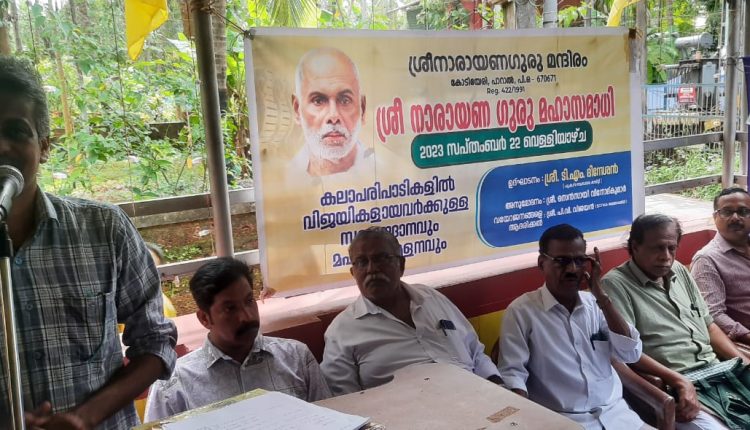 കോടിയേരി: ശ്രീ നാരായണഗുരു മന്ദിരം ശ്രീ നാരായണഗുരുവിന്റെ 96 മത് മഹാസമാധിയോട് അനുബന്ധിച്ചു വയോജനങ്ങളെ ആദരിക്കലും കലാകായിക പരിപാടികളിൽ വിജയികൾകളെ അനുമോദിക്കൽ ചടങ്ങും നടത്തി. ചടങ്ങ് പുരോഗമന കലാ സാഹിത്യ സംസ്ഥാന കമ്മിറ്റി അംഗം ടി. എം. ദിനേശൻ ഉത്ഘാടനം ചെയ്തു. സെൻസായി വിനോദ് കുമാർ വിജയികളെ അനുമോദിച്ചു സംസാരിച്ചു.സീനിയർ സിറ്റിസൺ ഫോറം വെൽഫയർ അസോസിയേഷൻ തലശ്ശേരി മേഖല കമ്മിറ്റി അംഗം പി വി വിജയൻ വയോജനങ്ങളെ ആദരിച്ചു.ഗുരുമന്ദിരം പ്രസിഡന്റ് കെ പി തിലകൻ അധ്യക്ഷത വഹിച്ച ചടങ്ങിൽ അനദോത്ത് എൽ പി സ്കൂൾ ഹെഡ് മാസ്റ്റർ ഹരിലാൽ,കോടിയേരി പബ്ലിക് ലൈബ്രറി പ്രസിഡന്റ് പി പ്രേമൻ ആശംസ നേർന്നു. ഗുരുമന്ദിരം സെക്രട്ടറി ടി പി സുതിഷ്ണൻ സ്വാഗതവും ജോയിന്റ് സെക്രട്ടറി കെ കെ പ്രവീൺ നന്ദിയും പറഞ്ഞു. ഉച്ചക്ക് അന്നദാനവും വൈകുനേരം സമൂഹപ്രാർത്ഥനയും നടന്നു.