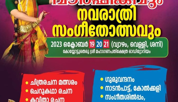 ഒക്ടോബർ 19,20, 21, തിയ്യതികളിൽ നടക്കും.കോയ്യോട്ട് തെരു ശ്രീ മഹാഗണപതി ക്ഷേത്രം സ്റ്റേജിലാണ് പരിപാടി കളരങ്ങേറുക. വിവിധ കലാ മത്സരങ്ങൾ, ഗുരുവന്ദനം, നാടൻ പാട്ട്, കോൽക്കളി, സംഗീത ശിൽപ്പം, തിരുവാതിര, കൈകൊട്ടിക്കളി, നൃത്ത നിശ, സാംസ്ക്കാരിക സമ്മേളനം എന്നിവയുണ്ടാകും ആഘോഷത്തോടനുബന്ധിച്ച് വിദ്യാർഥികൾക്കായി ജില്ലാതല സർഗ്ഗോത്സവം സംഘടിപ്പിക്കും.