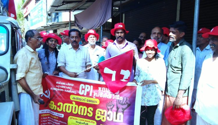 കരിയാട് : സി.പി.ഐ ദേശീയ പ്രക്ഷോഭത്തിന്റെ ഭാഗമായി ബി.ജെ.പി യെ പുറത്താക്കൂ രാജ്യത്തെ രക്ഷിക്കൂ എന്ന മുദ്രാവാക്യം ഉയർത്തിപ്പിടിച്ച് കരിയാട് മേഖല കാൽനട ജാഥ നടന്നു. ബാലപീടികയിൽ സി.പി.ഐ ജില്ല അസി.സെക്രട്ടറി എ. പ്രദീപൻ ജാഥ ലീഡർ നാങ്കണ്ടി രവിക്ക് പതാക കൈമാറി ഉദ്ഘാടനവും മുഖ്യ പ്രഭാഷണവും നടത്തി. കെ.കെ. ബാലൻ അധ്യക്ഷനായി. രാജൻ ശബരി സ്വാഗതം പറഞ്ഞു. പുതുശ്ശേരി മുക്ക് , മുക്കളിക്കര തുടങ്ങിയ സ്ഥലങ്ങളിൽ സ്വീകരണം ഏറ്റുവാങ്ങിയ ജാഥ കരിയാട് കെ.എൻ.യു.പി. സ്കൂൾ പരിസരത്ത് സമാപിച്ചു. സമാപന സമ്മേളനം സി.പി.ഐ തലശ്ശേരി മണ്ഡലം സെക്രട്ടറി അഡ്വ. എം.എസ്. നിഷാദ് ഉദ്ഘാടനം ചെയ്തു. പി.പ്രഭാകരൻ അധ്യക്ഷനായി. വിചിത്രൻ സ്വാഗതം പറഞ്ഞു. കെ.കെ. ബാലൻ, അഡ്വ. ശ്രീശൻ, എം. ബാലൻ, പൊന്ന്യം കൃഷ്ണൻ , സി.എൻ ഗംഗാധരൻ, വി.പി.അശോകൻ , പ്രേമൻ , ഇ. പുരുഷു, ശ്രീധരൻ എന്നിവർ സംസാരിച്ചു.