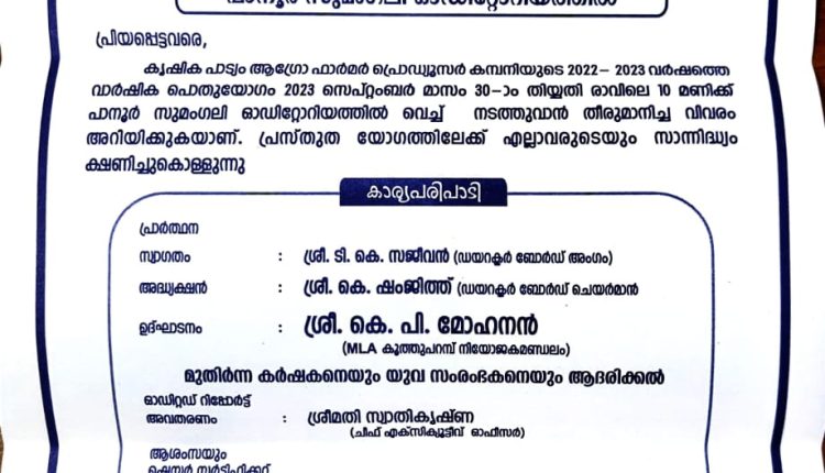പാനൂർ: കൃഷിക പാട്യം ആഗ്രോ ഫാർമർ പ്രൊഡ്യൂസർ കമ്പനി ലിമിറ്റഡ് വാർഷിക പൊതുയോഗം സെപ്റ്റംബർ 30 ശനി രാവിലെ 10 മണിക്ക് പാനൂർ സുമംഗലി ഓഡിറ്റോറിയത്തിൽ വച്ച് നടക്കുന്നതാണ്.