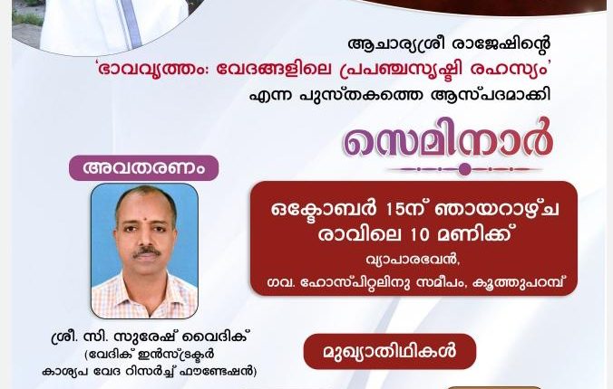 എൻ. ധനഞ്ജയൻ എന്നിവർ മുഖ്യാതിഥികളായി സെമിനാറിൽ പങ്കെടുക്കും.ആചാര്യ ശ്രീ രാജേഷിന്റെ”ഭാവവൃത്തം : വേദങ്ങളിലെ പ്രപഞ്ച സൃഷ്ടി രഹസ്യം ”