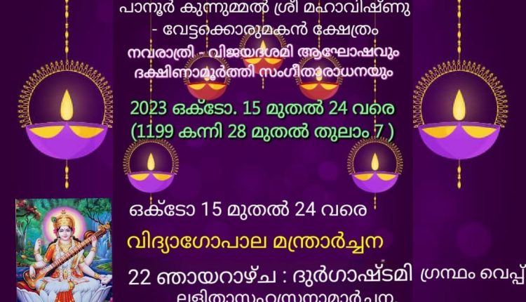 പാനൂർ :കുന്നുമ്മൽ ശ്രീ മഹാവിഷ്ണു – വേട്ടക്കൊരുമകൻ ക്ഷേത്രത്തിൽ നവരാത്രി ആഘോഷവും ദക്ഷിണാമൂർത്തി സംഗീതാരാധനയും ഒക്ടോബർ 15 ഞായാഴ്ച മുതൽ 24 ചൊവ്വാഴ്ച വരെ നടക്കും.