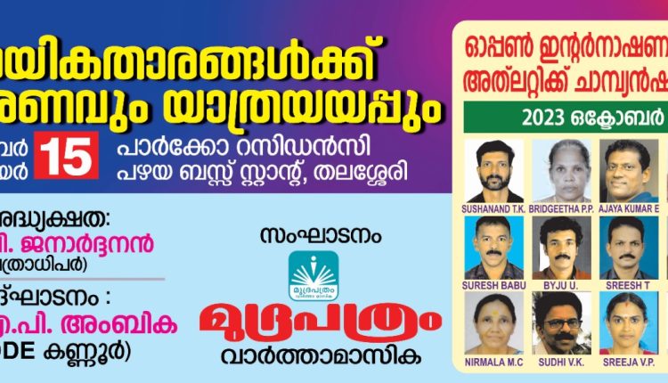 തലശ്ശേരി :മുദ്രപത്രം മാസികയുടെ ആഭിമുഖ്യത്തിൽ , ദുബായിൽ 27 മുതൽ 29 വരെ നടക്കുന്ന ഓപ്പൺ ഇന്റർനാഷണൽ മാസ്റ്റേർസ് അത് ലറ്റിക്ക് ചാമ്പ്യൻഷിപ്പിൽ പങ്കെടുക്കുന്ന കായികതാരങ്ങൾക്ക് മുദ്രപത്രം മാസിക ഒരുക്കുന്ന സ്വീകരണ-യാത്രയയപ്പ് പരിപാടി നാളെ ഉച്ചക്ക് 2.30 ന് തലശ്ശേരി പാർക്കോ റസിഡൻസിയിൽ നടക്കും.പി.ജനാർദ്ദനന്റെ അദ്ധ്യക്ഷതയിൽ കണ്ണൂർ ഡി.ഡി.ഇ , എ.പി. അംബിക ചടങ്ങ് ഉദ്ഘാടനം ചെയ്യും.ടി.കെ. സുശാനന്ദ് , ഇ. അജയകുമാർ , യു.ഷാജി , യു.ബൈജു , കെ. സാറ , എം.സി നിർമ്മല , പി.പി. ബ്രിഡ് ഗീത , എ.ഹസീന , സുരേഷ് ബാബു , ടി.ശ്രീഷ് , കെ.കെ. ഷാമിൻ , വി.കെ.സുധി ,ത്രേസ്യ ,പി.വി.അനീഷ ,വി.പി. ശ്രീജഎന്നിവരാണ് കായിക താരങ്ങൾ .കായിക-സാമൂഹിക-സാംസ്കാരിക-മാദ്ധ്യമ രംഗങ്ങളിലെ പ്രമുഖരായ സി.കെ. ബിന്ദുരാജ് ,ആർ. സരസ്വതി ,പി.പി. സനകൻ , കെ.സുനിൽ ,കെ.ദിനേശൻ ,പി.ദിനേശൻ , എം.ലക്ഷ്മണൻ മാസ്റ്റർ , കെ.വി.രജീഷ് ,