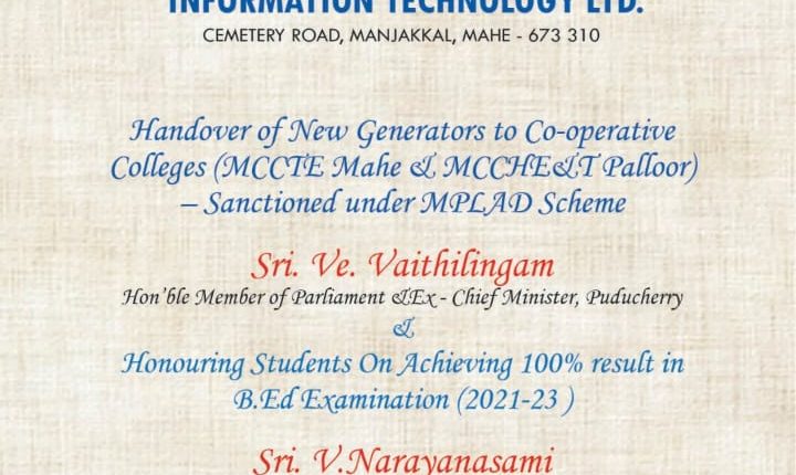 മാഹി : മാഹി സഹകരണ ബി എഡ് കോളേജിനും മാഹി കോപററേറ്റീവ് കോളേജ് ഓഫ് ഹയർ എഡ്യൂക്കേഷനും എം. പി.എൽഎഡി ഫണ്ടിൽ നിന്നും ഉള്ള രണ്ടു ജനറേറ്റർ കൈമാറൽ എം. പി.വി. വൈത്യലിംഗം നിർവഹിക്കും. നൂറു ശതമാനം വിജയം കൈവരിച്ച സഹകരണ ബി എഡ് കോളേജ് വിദ്യാർഥി കൾക്കുള്ള അനുമോദന ചടങ്ങും ഈ മാസം 27 വെള്ളിയാഴ്ച വൈകുന്നേരം 3 മണിക്ക് കോളേജ് ഓഡിറ്റോറിയത്തിൽ വച്ചു നടക്കും. ചടങ്ങി ൽ മുൻ കേന്ദ്രമന്ത്രി