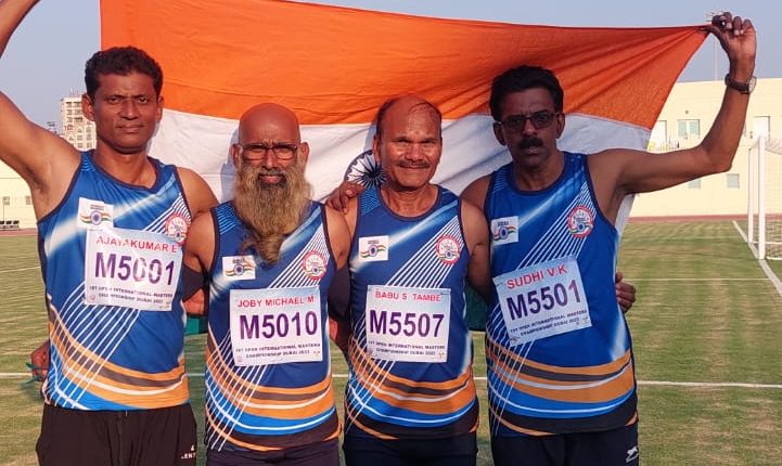 ദുബായ് :ദുബായിൽ നടന്നു വരുന്ന ഓപ്പൺ ഇന്റർനാഷണൽ മാസ്റ്റേഴ്സ് അത് ലറ്റിക്ക് ചാമ്പ്യൻഷ്യപ്പിൽ 4×100 മീറ്റർ റിലേ മത്സരത്തിൽ ഇന്ത്യൻ സംഘം സ്വർണ്ണ മെഡൽ കരസ്ഥമാക്കി. 50 മുതൽ 60 വയസ്സ് വരെ പ്രായമുള്ളവരുടെ വിഭാഗത്തിലാണ് ഇന്ത്യൻ ടീം ഒന്നാം സ്ഥാനം നേടിയത്.വി.കെ.സുധി , അജയകുമാർ ഇ ,ജോബി മൈക്കിൾ എം ,
