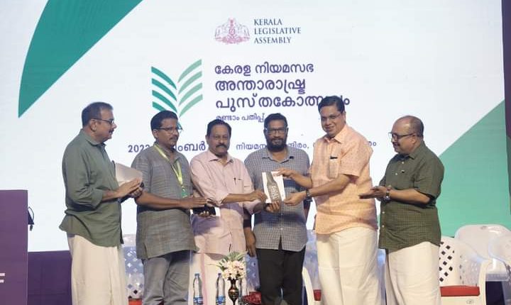 തിരുവനന്തപുരം : ദേശാഭിമാനി ന്യൂസ് എഡിറ്റർ ജയകൃഷ്ണൻ നരിക്കുട്ടി എഴുതി ജി വി ബുക്സ് പ്രസിദ്ധീകരിച്ച നൃത്തശാലയിലെ പ്രണയം എന്ന കഥാസമാഹാരം കേരള നിയമസഭ അന്താരാഷ്ട്ര പുസ്തകോത്സവ വേദിയിൽ നിന്ന് സ്പീക്കർ എ.എൻ ഷംസീർ മീഡിയ ചെയർമാൻ ആർ.എസ്.ബാബുവിന് നൽകി പ്രകാശനം ചെയ്യുന്നു.
