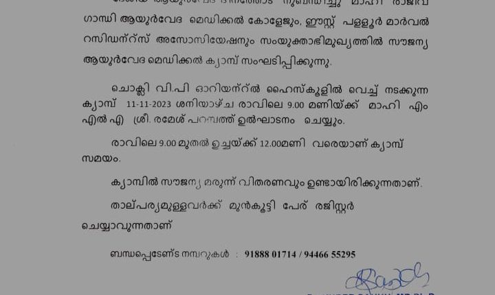 മാഹി: ദേശീയ ആയുർവ്വേദ ദിനത്തിൻ്റെ ഭാഗമായി മാഹി രാജീവ് ഗാന്ധി ആയുർവ്വേദ മെഡിക്കൽ കോളേജും ഈസ്റ്റ് പള്ളൂർ മാർവൽ റസിഡൻ്റ്സ് അസോസിയേഷനും ചേർന്ന് സൗജന്യ മെഡിക്കൽ ക്യാമ്പ് നടത്തുന്നു. മരുന്ന് സൗജന്യമായി നൽകും. 11ന് രാവിലെ 9 ന് ചൊക്ലി വി.പി.ഓറിയൻ്റൽ ഹൈസ്കൂളിൽ നടക്കുന്ന ക്യാമ്പ് രമേശ് പറമ്പത്ത് എം.എൽ.എ. ഉദ്ഘാടനം ചെയ്യും. രാവിലെ 9 മുതൽ 11 വരെ നടക്കുന്ന ക്യാമ്പിൽ പങ്കെടുക്കാൻ മുൻകൂട്ടി പേര് രജിസ്റ്റർ ചെയ്യാം. ഫോൺ: 9188801714, 9446655295.