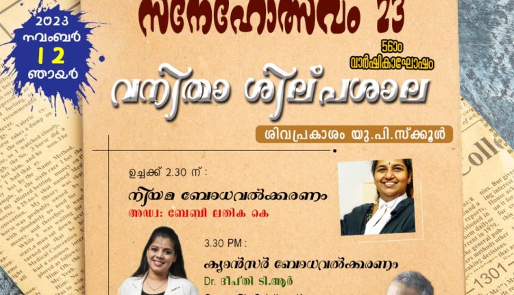 3.30 ന് ക്യാൻസർ ബോധവൽക്കരണ പരിപാടിയിൽ കണ്ണൂർ ഓൺ ക്യൂർ ബയോ സൊലൂഷൻസിലെ ഡോക്ടർ ടി.ആർ ദീപ്തി ആരോഗ്യ ക്ലാസ്സ് നയിക്കും.