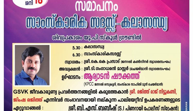 ജീവകാരുണ്യ പ്രവർത്തനങ്ങൾക്ക് കരുത്തായി ക്യാപ്റ്റൻ രജിത്ത് രാജ് നിട്ടുക്കണ്ടിയും ജിംഷ രജിത്തും നൽകുന്ന പാലിയേറ്റീവ് ഉപകരണങ്ങൾ പിണറായി എസ്.ഐ ഭവിഷ് ഏറ്റുവാങ്ങും. തുടർന്ന് പ്രശസ്ത കലാകാരന്മാർ അണിനിരക്കുന്ന കലാസന്ധ്യയും അരങ്ങേറുമെന്ന് ഭാരവാഹികളായ കെ.കെ. പ്രസാദ് , പി.കെ. ലിജീഷ് , സി.കെ.വിജയൻ മാസ്റ്റർ , പി പി സജീവൻ എന്നിവർ പത്രസമ്മേളനത്തിൽ അറിയിച്ചു.