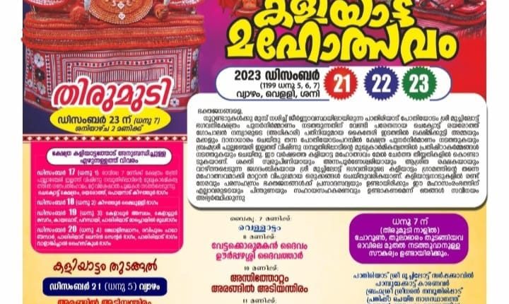 കൂത്തുപറമ്പ് :പാതിരിയാട് പോതിയോടം ശ്രീ മുച്ചിലോട്ട് ഭഗവതീ ക്ഷേത്രം കളിയാട്ട മഹോത്സവം ഡിസംബർ 21 മുതൽ 23 വരെ നടക്കും . മൂന്ന് ദിവസത്തെ ഉത്സവം 21 ന് വ്യാഴാഴ്ച തുടങ്ങും.അരങ്ങിൽ അടിയന്തിരം കുഴിയടുപ്പിൽ അഗ്നി പകര ൽ ആദ്യദിനമാണ്.22 വെള്ളിയാഴ്ച രാവിലെ 9 മണിക്ക് കണ്ണങ്ങാട്ട് ഭഗവതി , വൈകിട്ട് 3 ന് പുലിയൂർ കാളി , പാതിരിയാട് മുച്ചിലോട്ട് പരസരത്ത് തിരുവായുധം എഴുന്നെള്ളത്ത് എന്നിവയുണ്ടാകും. വൈകീട്ട് 7 മണിക്ക് വെള്ളാട്ടം , രാത്രി 8 ന് വേട്ടക്കൊരുമകൻ ദൈവം , ഊർപ്പഴശ്ശി ദൈവത്താർ , 10 മണിക്ക് അന്തിത്തോറ്റം , അരങ്ങിൽ അടിയന്തിരം , 11 മണിക്ക് പുലിരൂപക ണ്ഠൻ ദൈവം , തുടർന്ന് കല്യാണ പന്തലിൽ എഴുന്നെള്ളത്ത് എന്നിവ നടക്കും.23 ന് ശനിയാഴ്ച കൊടിയിലത്തോറ്റം , നരമ്പിൽ ഭഗവതി , കണ്ണങ്ങാട്ട് ഭഗവതി , വിഷ്ണു മൂർത്തി , പുലിയൂർ കാളി , മേലേരി കൈയേൽക്കൽ എന്നിവയും ഉണ്ടാകും.