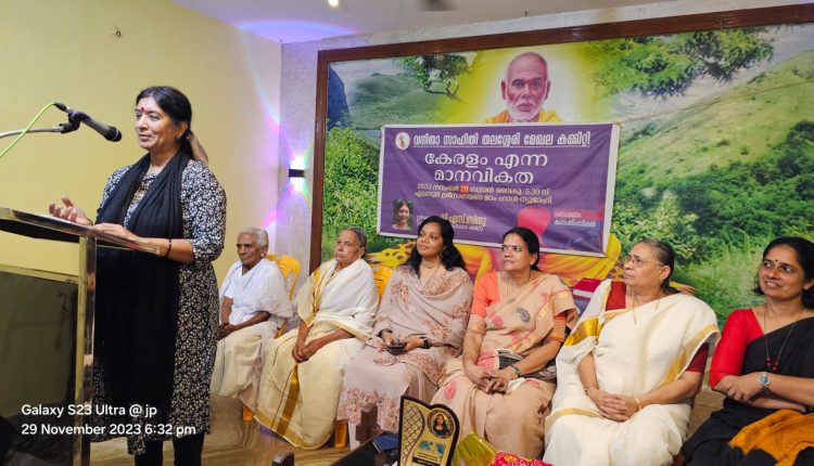 ന്യൂമാഹി : വനിതാ സാഹിതി തലശ്ശേരി മേഖല കമ്മിറ്റി “കേരളം എന്ന മാനവികത ” എന്ന വിഷയത്തിൽ പ്രഭാഷണ പരിപാടി നടത്തി. ആദര സമർപ്പണം, കലാപരിപാടികൾ എന്നിവയുമുണ്ടായി. ഏടന്നൂർ ശ്രീനാരായണ മഠം ഹാളിൽ കവിയും കേരള സാഹിത്യ അക്കാദമി എക്സിക്യൂട്ടീവ് അംഗവുമായ വി.എസ്. ബിന്ദു ഉദ്ഘാടനം ചെയ്തു. ആമിന മാളിയേക്കൽ അധ്യക്ഷത വഹിച്ചു.