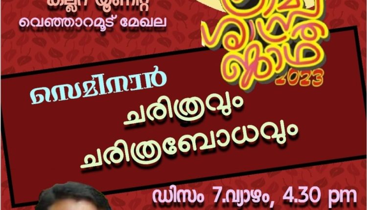 തിരുവനന്തപുരം : പുത്തൻ ഇന്ത്യ പണിയുവാൻ ശാസ്ത്രബോധം വളരണം എന്ന സന്ദേശമുണർത്തി കേരള ശാസ്ത്ര സാഹിത്യ പരിഷത്ത് വെഞ്ഞാറമ്മൂട് മേഖല , കല്ലറ യൂണിറ്റിന്റെ ആഭിമുഖ്യത്തിൽ , ചരിത്രവും ചരിത്രാവബോധവും എന്ന വിഷയത്തിൽ സെമിനാർ സംഘടിപ്പിക്കുന്നു. ഡിസംബർ 7 വ്യാഴാഴ്ച വൈകിട്ട് 4.30 ന് കല്ലറ ജിവിഎച്ച്എസ്എസ് ൽ സെമിനാർ നടക്കും. ഗ്രാമശാസ്ത്ര ജാഥയുടെ ഭാഗമായാണ് സെമിനാർ നടത്തുന്നത്. ചിതറ ജിഎച്ച്എസ്എസ് പ്രിൻസിപ്പൽ എസ് എം. യൂസഫ് കുമാർ വിഷയാവതരണം നിർവ്വഹിക്കും.