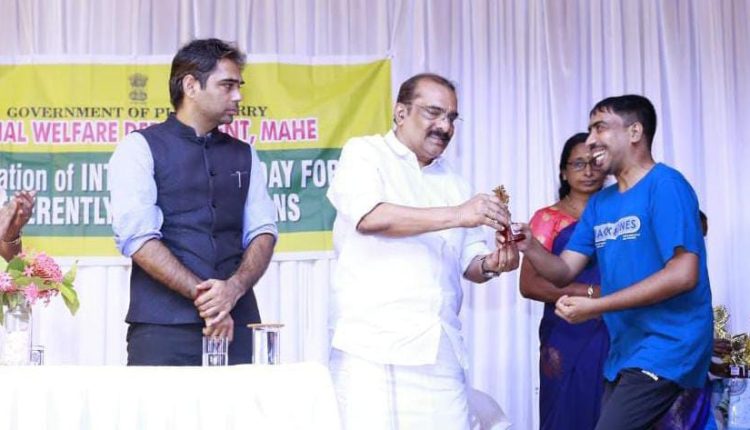 മാഹി: പുതുച്ചേരി സാമൂഹ്യ ക്ഷേമ വകുപ്പിന്റെ ആഭിമുഖ്യത്തിൽ മാഹിയിൽ വിവിധ പരിപാടികളോടെ ഭിന്നശേഷി ദിനാചരണം സംഘടിപ്പിച്ചു. മാഹി ഫിഷർമെൻ കമ്യൂണിറ്റി ഹാളിൽ വെച്ച് നടന്ന പരിപാടി രമേശ് പറമ്പത്ത് എം.എൽ.എ ഉദ്ഘാടനം ചെയ്തു. റീജ്യണൽ അഡ്മിനിസ്ട്രേറ്റർ ശിവ് രാജ് മീണ അധ്യക്ഷത വഹിച്ചു. കെ.ഇ.സഫിയ ഓട്ടിസം സെന്റർ പ്രിൻസിപ്പൽ എൽ.ശശികല ബോധവത്ക്കരണ ക്ലാസെടുത്തു. എം.സി.വിജില സ്വാഗതവും ഇ. ഇന്ദിര നന്ദിയും പറഞ്ഞു. ഭിന്നശേഷിക്കാർക്ക് വേണ്ടി നടത്തിയ കായിക മത്സരങ്ങളിൽ വിജയികളായവർക്ക് സമ്മാനങ്ങൾ വിതരണം ചെയ്തു. കരുണ അസോസിയേഷനു വേണ്ടി ശിവൻ തിരുവങ്ങാടൻ, സജീർ ചെറുകല്ലായി എന്നിവർ വിശിഷ്ടാഥിതിളെ ആദരിച്ചു.