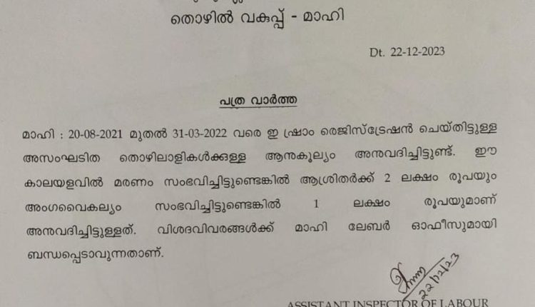 മാഹി : 20-08-2021 മുതൽ 31-03-2022 വരെ ഇഷ്രാം രജിസ്ട്രേഷൻ ചെയ്തിട്ടുള്ള അസംഘടിത തൊഴിലാളികൾക്കുള്ള ആനുകൂല്യം അനുവദിച്ചിട്ടുണ്ട്. ഈ കാലയളവിൽ മരണം സംഭവിച്ചിട്ടുണ്ടെങ്കിൽ ആശ്രിതർക്ക് 2 ലക്ഷം രൂപയും അംഗവൈകല്യം സംഭവിച്ചിട്ടുണ്ടെങ്കിൽ 1 ലക്ഷം രൂപയുമാണ് അനുവദിച്ചിട്ടുള്ളത്. വിശദവിവരങ്ങൾക്ക് മാഹി ലേബർ ഓഫീസുമായി ബന്ധപ്പെടാവുന്നതാണെന്ന് മാഹി അസിസ്റ്റന്റ് ലേബർ ഇൻസ്പെക്ടർ കെ. മനോജ് കുമാർ അറിയിച്ചു.