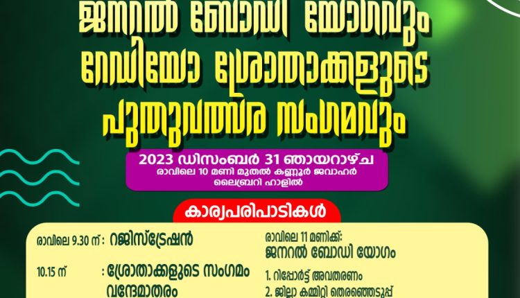 കണ്ണൂർ: കമ്മ്യൂണിറ്റി റേഡിയോ ഉൾപ്പെടെയുള്ള കേരളത്തിലെ വിവിധ റേഡിയോ നിലയങ്ങളുടെ ശ്രോതാക്കളുടെ കൂട്ടായ്മയും കലാ സാംസ്കാരിക സംഘടനയുമായ കാഞ്ചീരവം കലാവേദിയുടെ കണ്ണൂർ ജില്ലാ കമ്മിറ്റി സംഘടിപ്പിക്കുന്ന റേഡിയോ സുഹൃദ് സംഗമവും പുതുവത്സര സ്വാഗതസദസ്സും 31 ന് ഞായറാഴ്ച രാവിലെ ഒമ്പതര മണി മുതൽ കണ്ണൂർ ജവാഹർ ലൈബ്രറി ഹാളിൽ നടക്കുമെന്ന് പ്രസിഡണ്ട് കെ. ബാലകൃഷ്ണൻ,സെക്രട്ടറി രാജൻ ചന്ദ്രോത്ത് എന്നിവർ അറിയിച്ചു. ആകാശവാണിയുടെ കണ്ണൂർ എഫ്.എമ്മിലെ തത്സമയ പരിപാടികളിൽ അവതാരകനും റേഡിയോ ടീച്ചർ ക്വിസ്സ് പരമ്പരയുടെ പ്രൊഡക്ഷൻ പാനൽ അംഗവുമായ എ.കെ രതീഷ് സംഗമം ഉദ്ഘാടനം ചെയ്യും.ചടങ്ങിൽ കാഞ്ചീരവം മാസികയുടെ പുതിയ ലക്കത്തിന്റെ പ്രകാശനവും അദ്ദേഹം നിർവ്വഹിക്കും.
