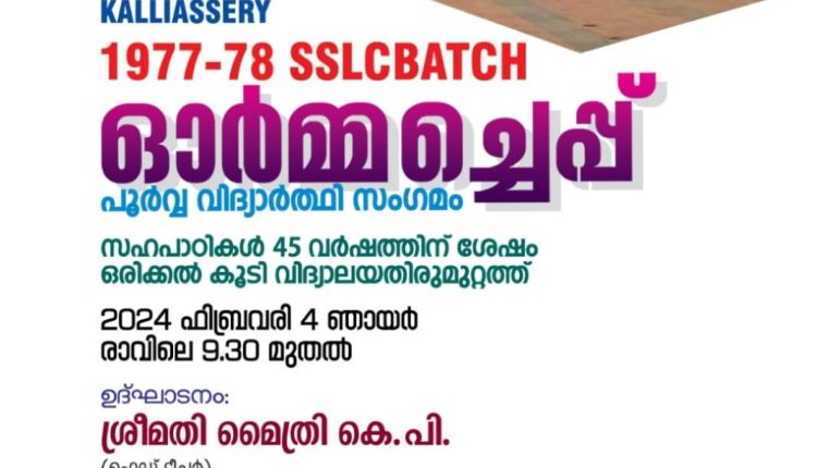 കല്യാശേരി : നാലരപ്പതിറ്റാണ്ടുകൾക്ക് ശേഷം ഓർമ്മകളുമായി ഒത്തിരിക്കാൻ കല്യാശേരി, കെ.പി.ആർ ഗോപാലൻ ഗവ.ഹൈസ്കൂളിലെ 1977 – 78 എസ്.എസ്.എൽ.സി ബേച്ചിലെ വിദ്യാർത്ഥികൾ ഫെബ്രുവരി 4 ഞായറാഴ്ച വിദ്യാലയത്തിരുമുറ്റത്ത് ഒരുമിക്കും. 1977-78 വർഷത്തെ എസ് എസ് എൽ സി ബാച്ചിലെ മുന്നോറോളം പേരാണ് പൂർവ്വ വിദ്യാർത്ഥി സംഗമത്തിനെത്തുന്നത്. രാവിലെ ഒമ്പതരയ്ക്ക് കൂട്ടായ്മ ആരംഭിക്കും. സ്കൂൾ പ്രധാനദ്ധ്യാപിക കെ.പി. മൈത്രി പൂർവ്വവിദ്യാർത്ഥി സംഗമം ഉദ്ഘാടനം ചെയ്യും. “ഓർമ്മച്ചെപ്പ് 2024” എന്നാണ് ഈ സംഗമത്തിന് പേര് നൽകിയത്.