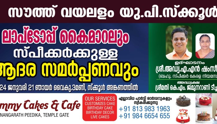 തലശ്ശേരി: സൗത്ത് വയലളo യു.പി സ്കൂൾ ലാപ്ടോപ്പുകളുടെ കൈമാറലും സ്പീകർക്കുള്ള ആദരവ് സമർപ്പണവും 2024 ജനുവരി 21 ന് തലശ്ശേരി ചെയർപേഴ്സൺ ശ്രീമതി കെ.എം ജമുനാറാണി ടീച്ചറുടെ അധ്യക്ഷതയിൽ ബഹു: കേരളം നിയമസഭാ സ്പീക്കർ അഡ്വ . എ. എൻ ഷംസീർ ഉദ്ഘാടനം ചെയ്തു.