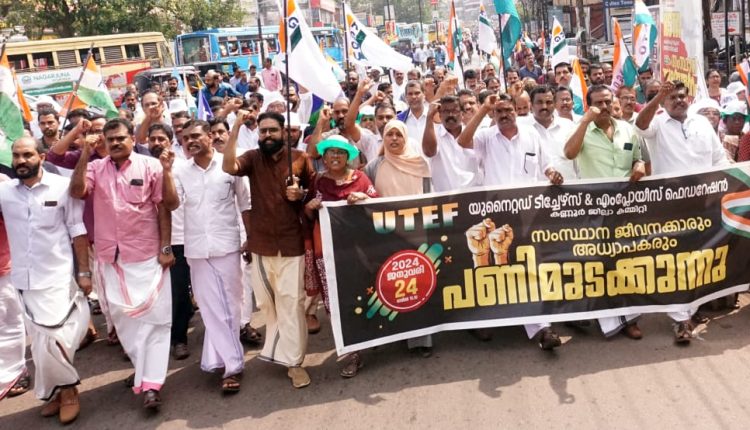 കണ്ണൂർ :അഴിമതിയും ധൂർത്തും മുഖമുദ്രയാക്കിയ പിണറായി സർക്കാർ സാമ്പത്തിക പ്രതിസന്ധിയുടെ പേരു പറഞ്ഞ് അധ്യാപകരുടെയും ജീവനക്കാരുടെയും ന്യായമായ അവകാശങ്ങൾ കവർന്നെടുക്കുന്നത് അവസാനിപ്പിക്കണമെന്ന് എ.ഐ സി.സി മെമ്പർ വി.എ.നാരായണൻ ആവശ്യപ്പെട്ടു.യുനൈറ്റഡ് ടീച്ചേഴ്സ് ആൻ്റ് എംപ്ലോയീസ് ഫെഡറേഷൻ ( യു.ടി.ഇ.എഫ് ) ജില്ല കമ്മിറ്റിയുടെ നേതൃത്വത്തിൽ പണിമുടക്കിയ അധ്യാപകരും ജീവനക്കാരും കണ്ണൂരിൽ നടത്തിയ പ്രകടനവും പൊതുയോഗവും ഉദ്ഘാടനം ചെയ്യുകയായിരുന്നു അദ്ദേഹം.ഇന്ത്യൻ യൂണിയൻ മുസ്ലിം ലീഗ് ജില്ല സെക്രട്ടറി അഡ്വ. എം.പി മുഹമ്മദലി മുഖ്യഭാഷണം നടത്തി.