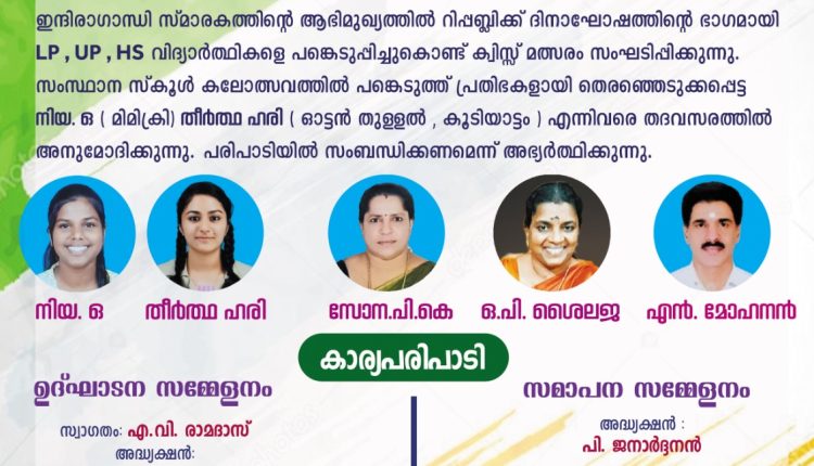 തലശ്ശേരി: പൊന്ന്യം പുല്ലോടി ഇന്ദിരാഗാന്ധി സ്മാരകമന്ദിരത്തിൽ 26 വെള്ളിയാഴ്ച റിപ്പബ്ലിക് ദിനാഘോഷവും അനുമോദന സദസ്സും നടക്കും.ഉച്ചയ്ക്ക് 2.30ന് ചടങ്ങുകൾ ആരംഭിക്കും.റിപ്പബ്ലിക് ദിനാഘോഷത്തിന്റെ ഭാഗമായി സ്കൂൾ വിദ്യാര്ത്ഥികൾക്ക് എൽ പി യു പി വിഭാഗങ്ങളിൽ ക്വിസ്സ് മത്സരം നടത്തും.